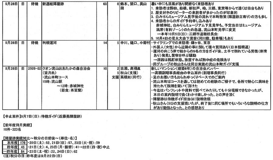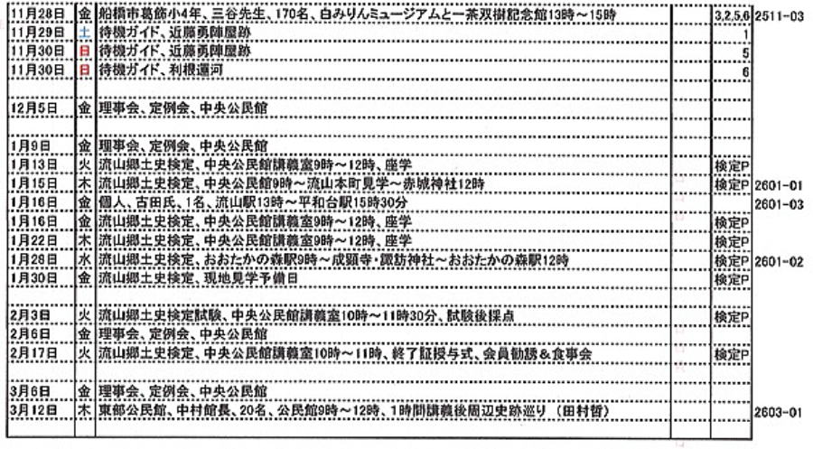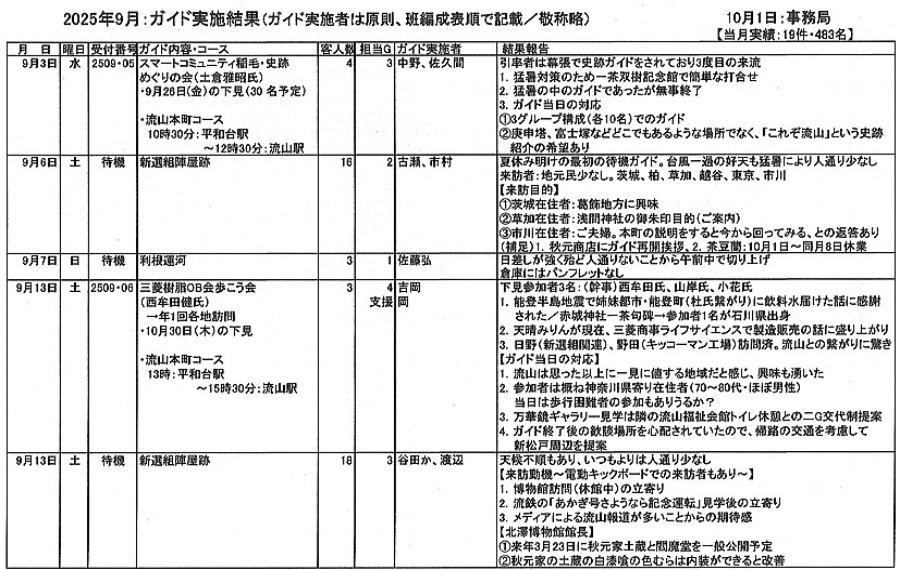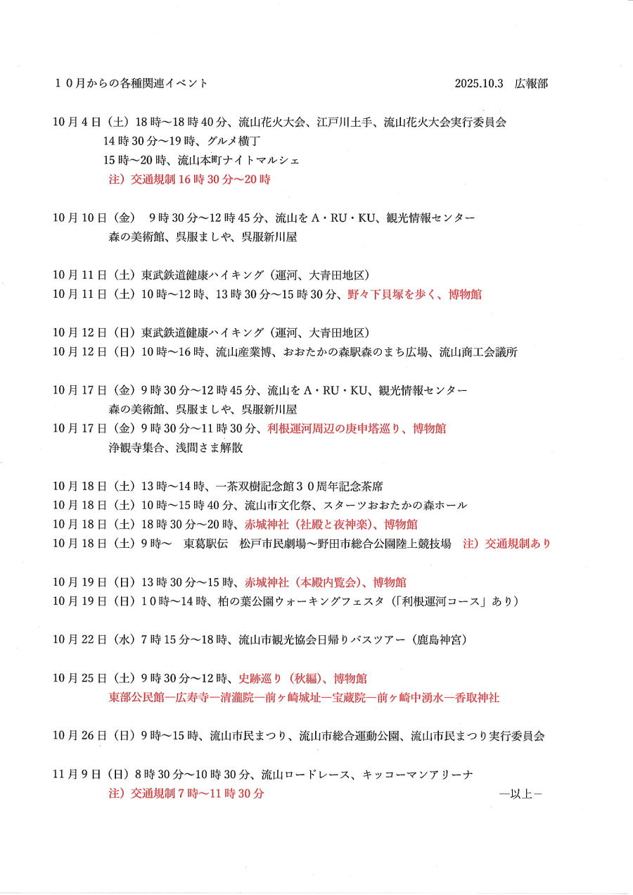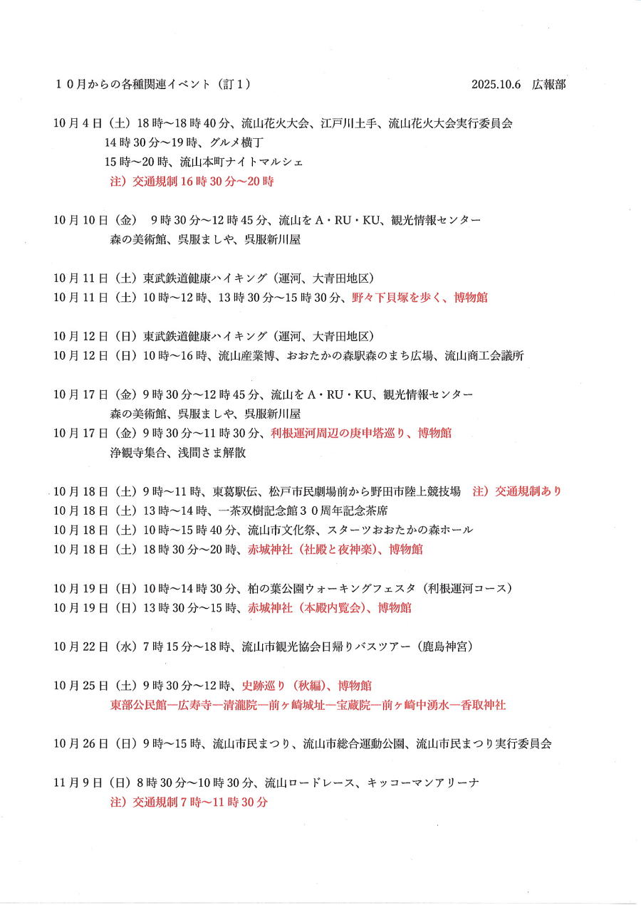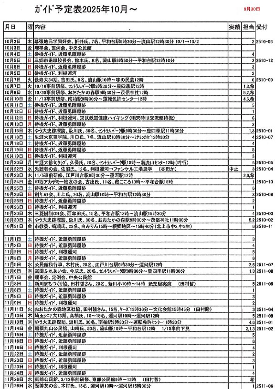 1.日 時 令和7年10月3日(金) 13時~15時 2.場 所 流山市中央公民館 講義室 3.議事予定 (1)現況報告・連絡事項 (2)理事会報告 (3)各部報告(総務部、企画部、広報部) (4)ガイド部報告 ・9月ガイド実施結果報告(コピーして定例会に持参してください) ・10月以降ガイドスケジュール(コピーして定例会に持参してください) (5)その他・連絡 (6)グループ別ミーティング後自由解散