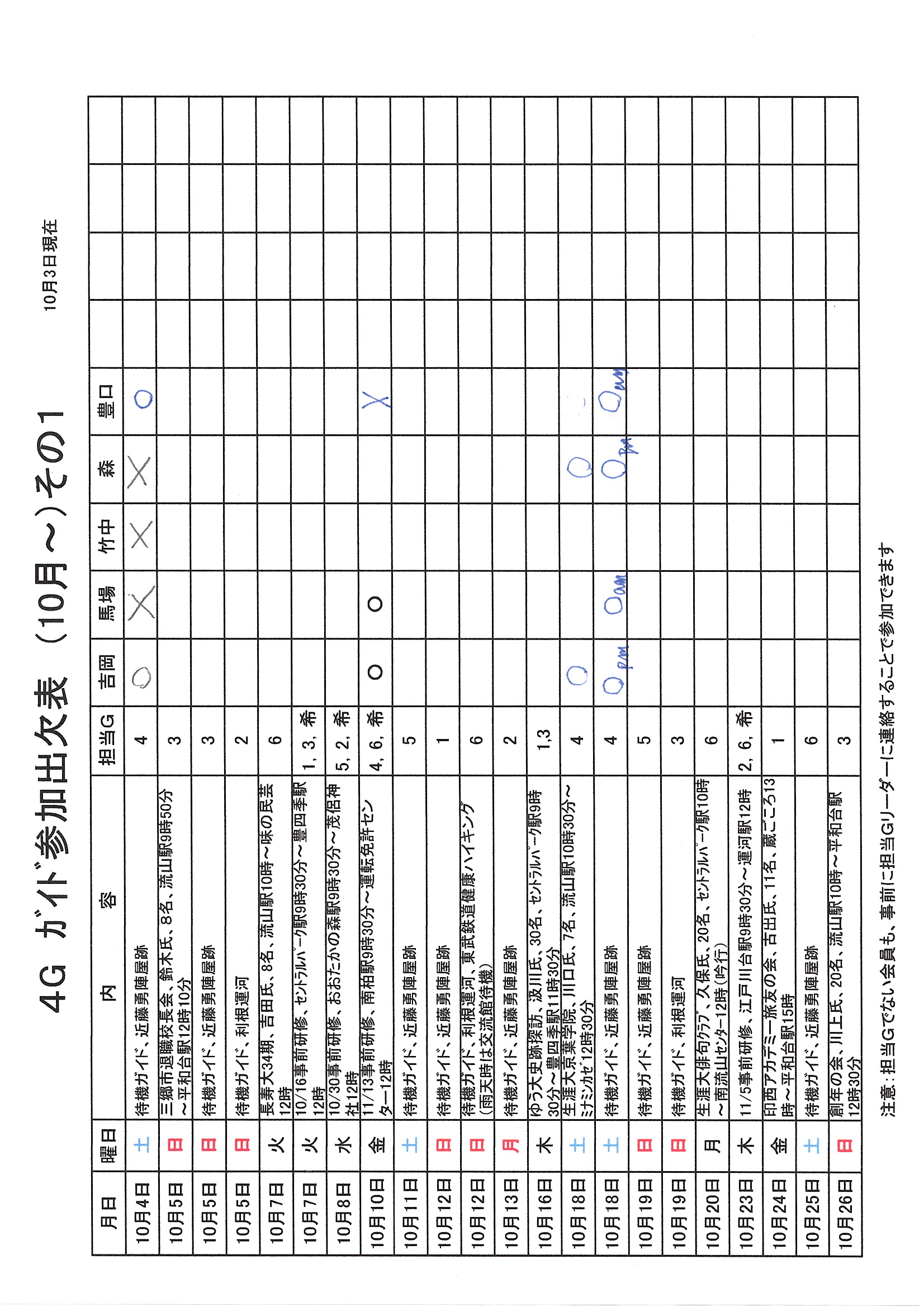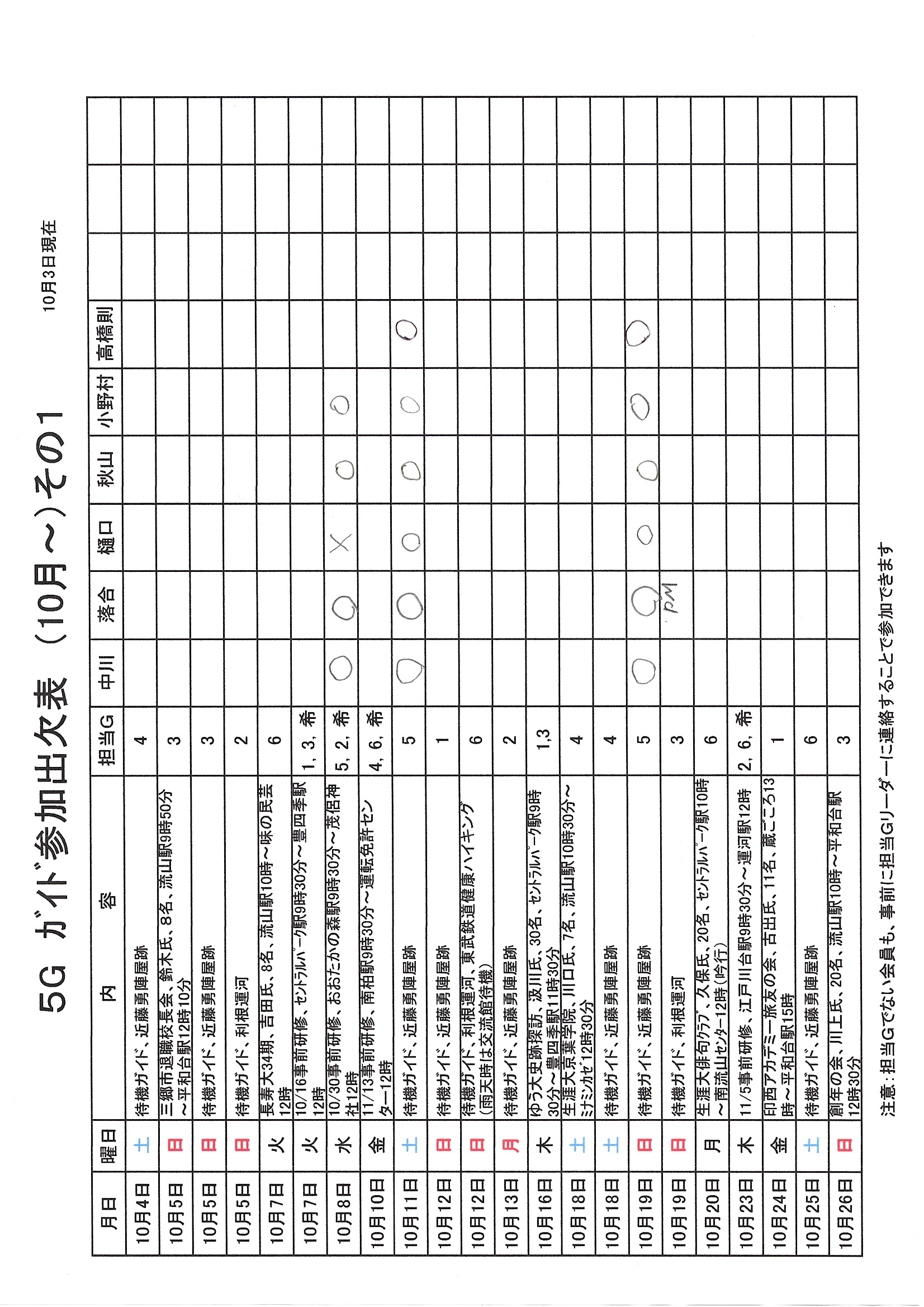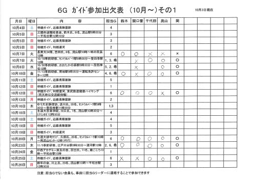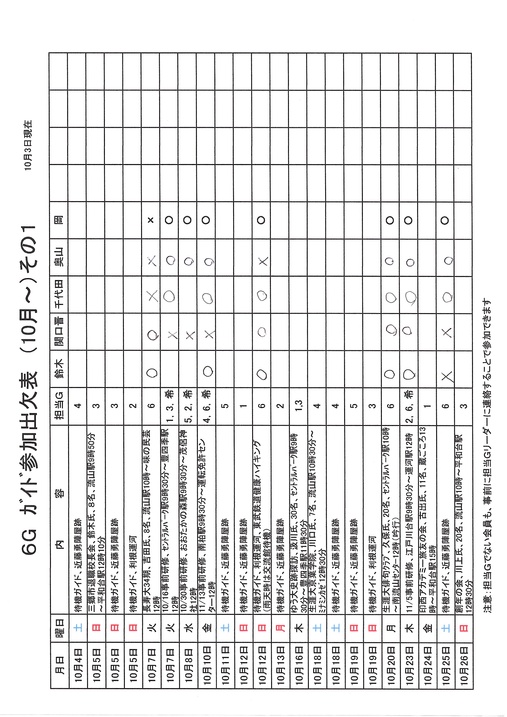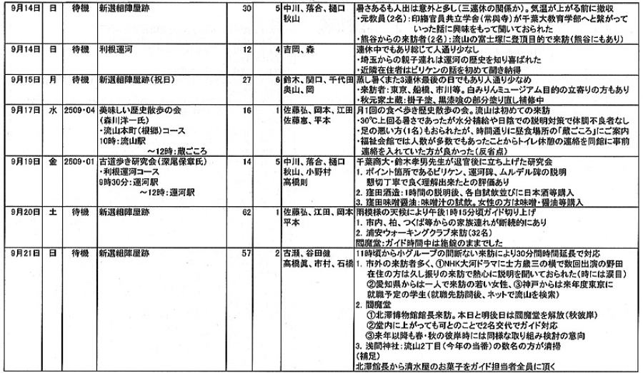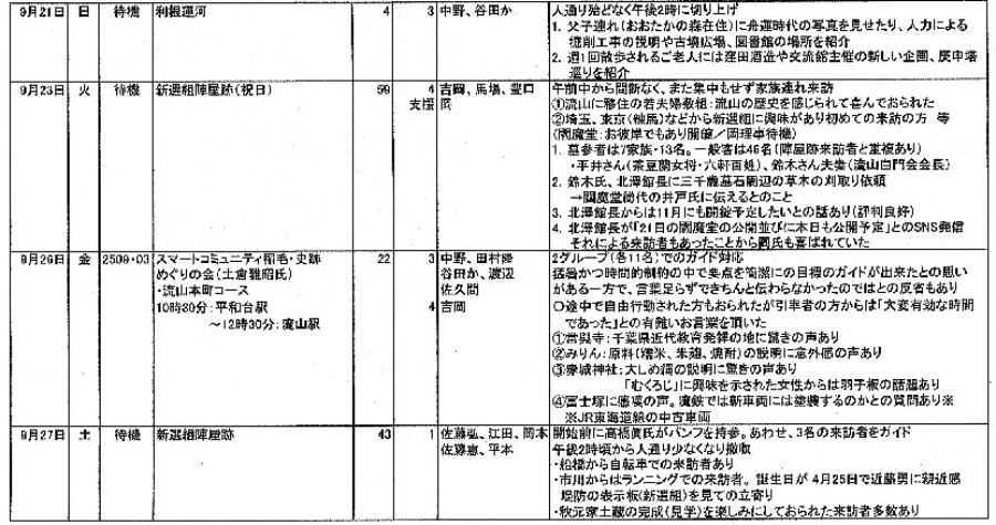1.日 時 令和7年10月3日(金) 13時~15時 2.場 所 流山市中央公民館 講義室 3.議事予定 (1)現況報告・連絡事項 (2)理事会報告 (3)各部報告(総務部、企画部、広報部) (4)ガイド部報告 ・9月ガイド実施結果報告(コピーして定例会に持参してください) ・10月以降ガイドスケジュール(コピーして定例会に持参してください) (5)その他・連絡 (6)グループ別ミーティング後自由解散