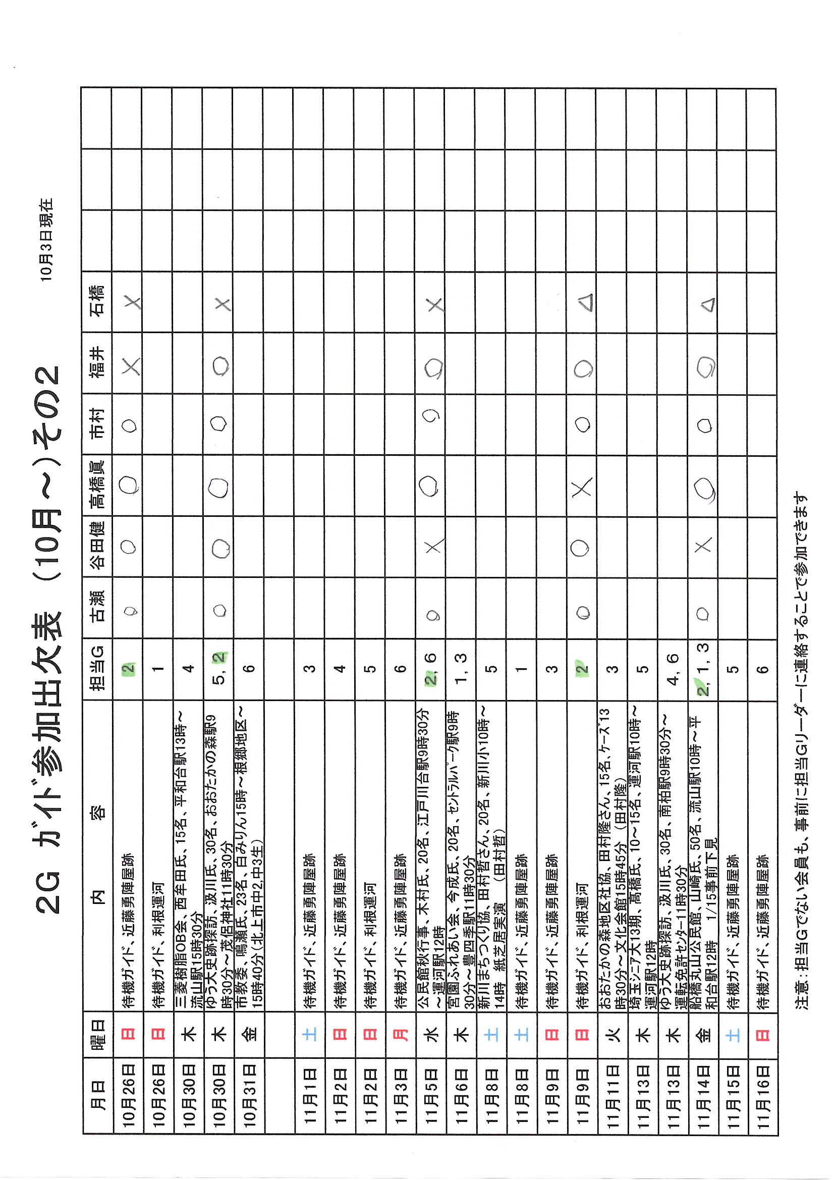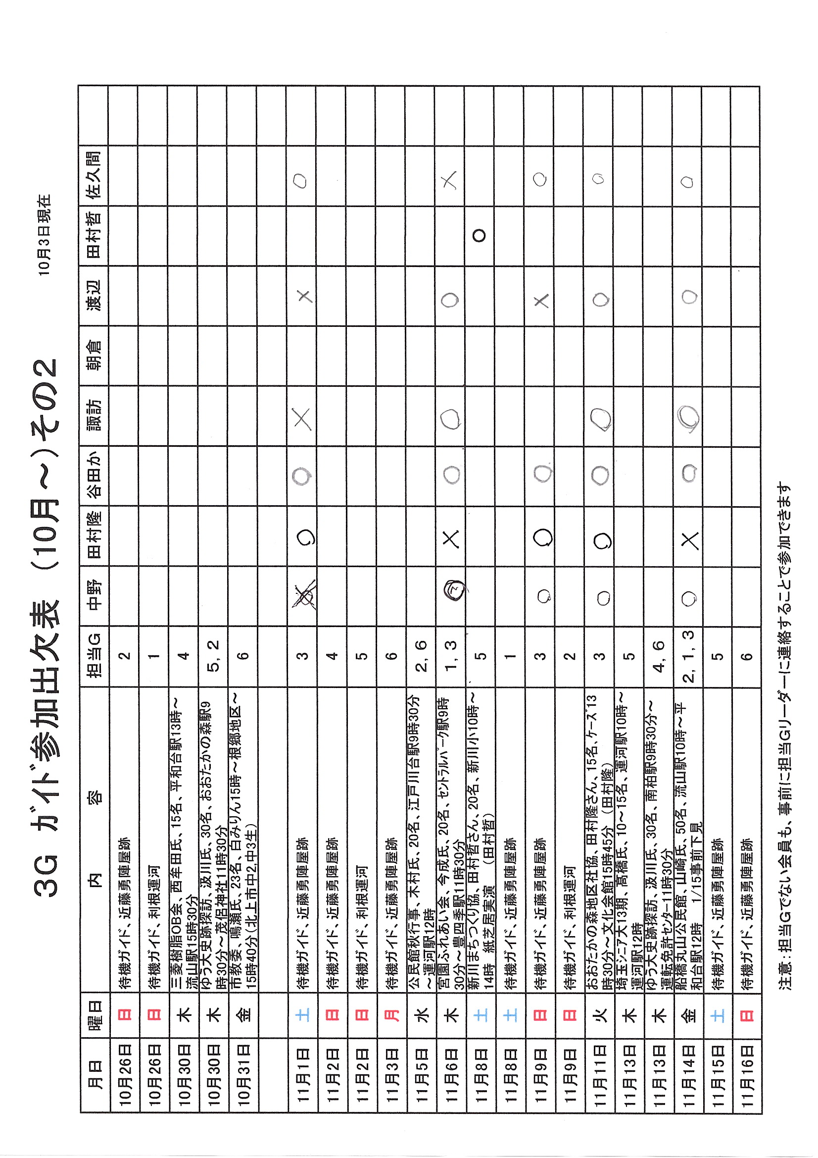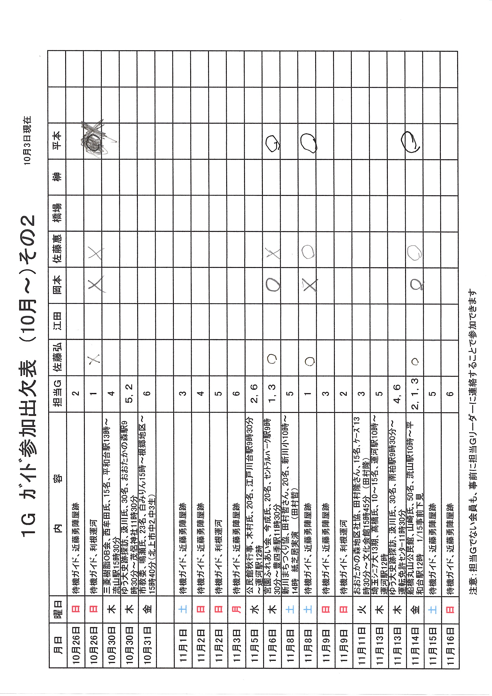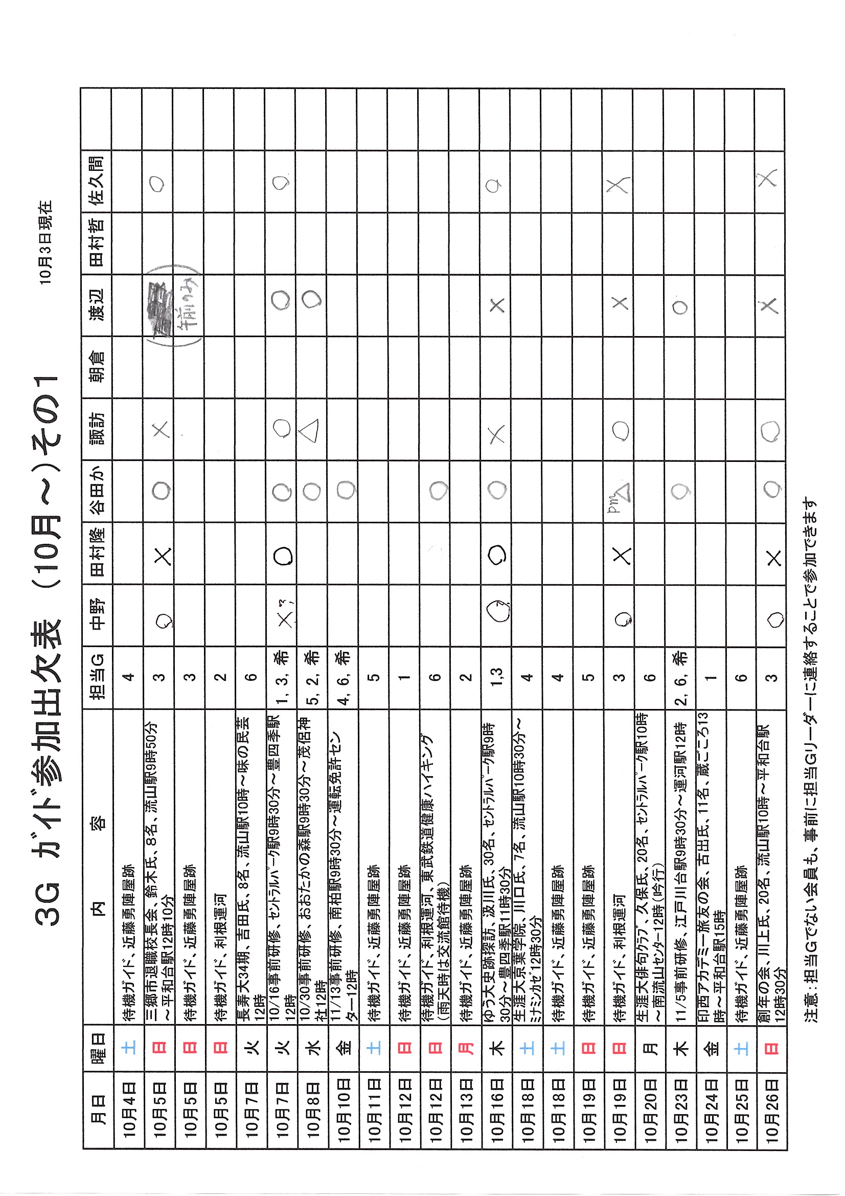1.日 時 令和7年10月3日(金) 13時~15時 2.場 所 流山市中央公民館 講義室 3.議事予定 (1)現況報告・連絡事項 (2)理事会報告 (3)各部報告(総務部、企画部、広報部) (4)ガイド部報告 ・9月ガイド実施結果報告(コピーして定例会に持参してください) ・10月以降ガイドスケジュール(コピーして定例会に持参してください) (5)その他・連絡 (6)グループ別ミーティング後自由解散